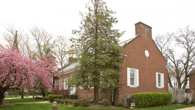 The Bishop Memorial Library is used as a meeting room space and is a venue for library programs. There are additional library offices on the lower lever. The building was constructed in 1941 as a public library for Toms River, using the accrued assets of Nathaniel Holmes Bishop III, a local author and cranberry-grower. Mr. Bishop moved to Ocean County from Massachusetts after the Civil War and as an author and sportsman, became known for his books about the Barnegat Bay sneak box and his travels in a "paper canoe". Both Bishop and his wife, Mary Ball, advocated the founding of a public library for Toms River and provided in their wills for the purchase of land and subsequent design of a spacious brick Georgian building. Since the library opened, it has served both the local citizens and those of the county when Dover Township, now Toms River Township, joined the Ocean County Library system in the 1970s. The Bishop Memorial Library underwent a full renovation completed in 2009. The beautiful chandelier, made of brass and rose-colored glass, that hangs in the main room was donated to the library by the Toms River Yacht Club.